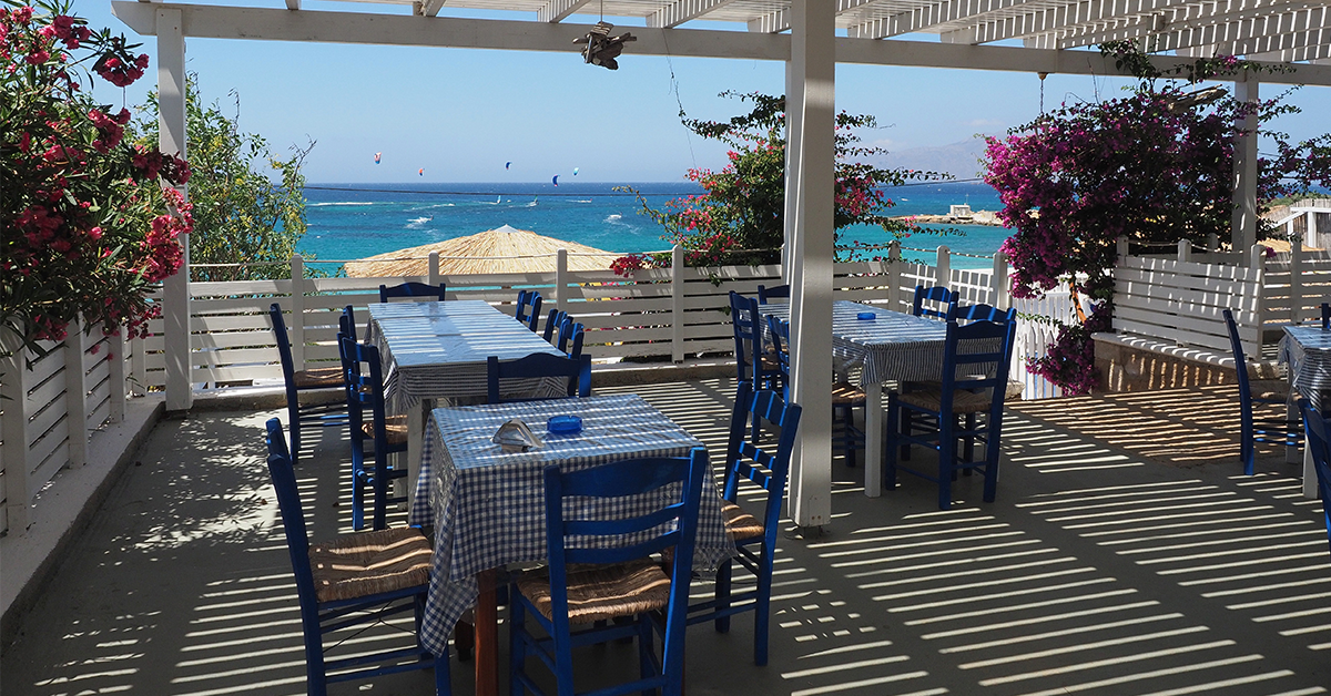 Nach dem Kitesurfen lädt die Taverne bei GreatDayz Karpathos direkt am Strand zum Entspannen ein. Hier erwarten dich regionale griechische Küche, frische Snacks, kalte Getränke und ein traumhafter Blick auf das Meer.
